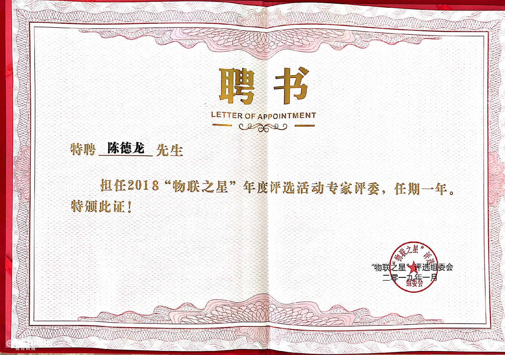 祝賀我司總經(jīng)理陳德龍先生,擔(dān)任“物聯(lián)之星”專家評委